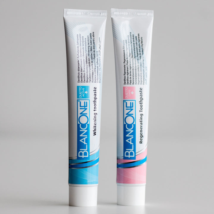 BlancOne® DUETTO perustuu kahden vuorotellen käytettävän entsyymihammastahnan vaikutukseen, ja sillä on alhainen hankausindeksi.